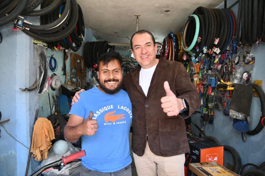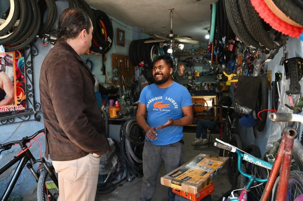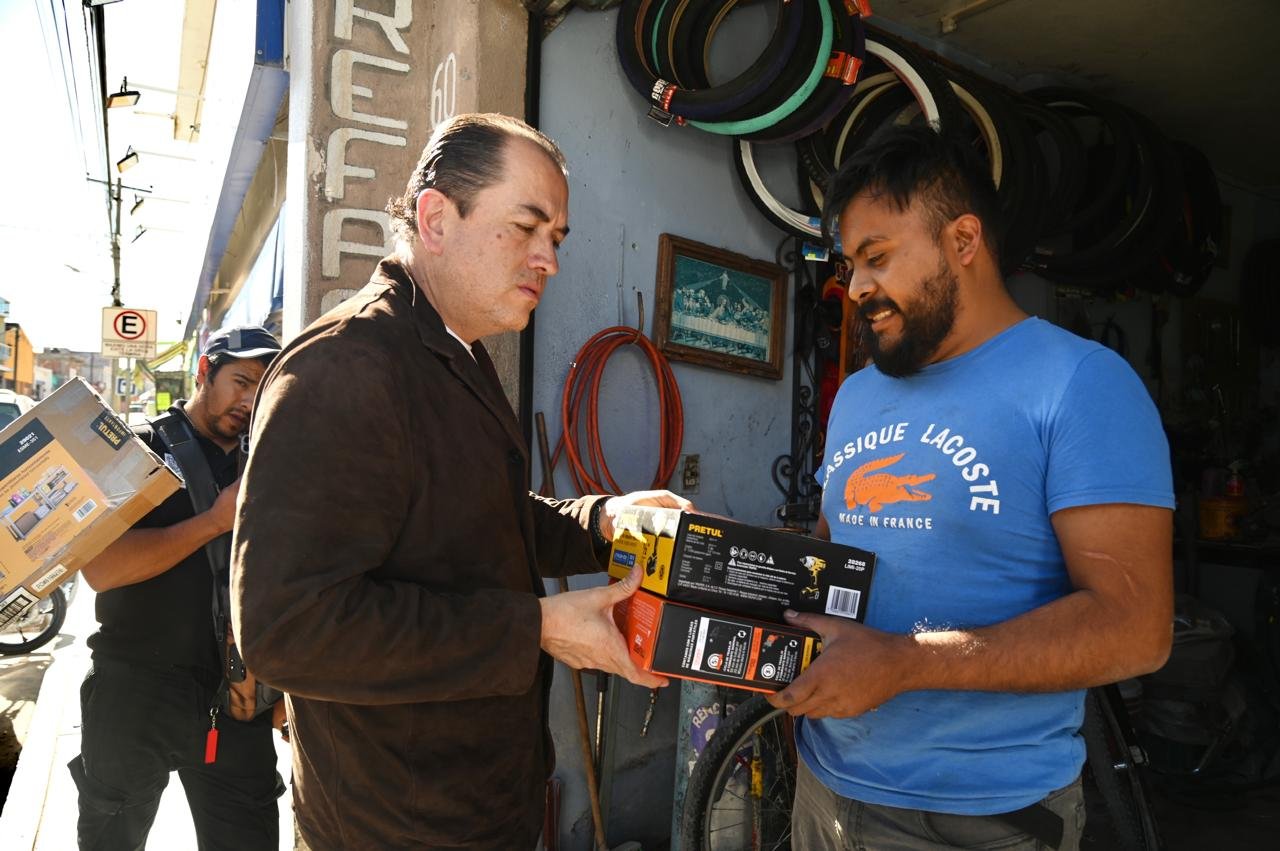 Ahí, Adrián Hernández le hizo la entrega de equipo de trabajo para fortalecer su taller de bicicletas y poder atender a más personas de la colonia Lindavista y sus alrededores, ya que el negocio es el principal sustento de su hogar.