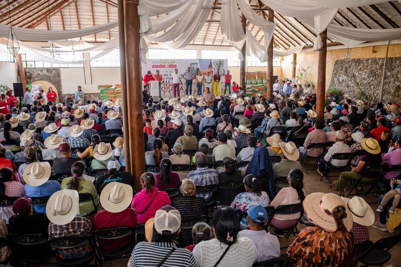 Acompañado por poco más de 1,000 campesinos y miembros de sus familias, el presidente municipal Mauricio Trejo hizo entrega de 2,350 sacos de semilla mejorada de maíz.