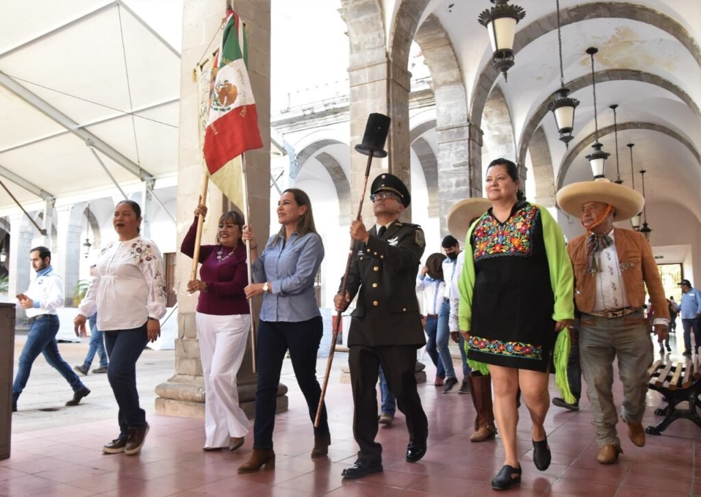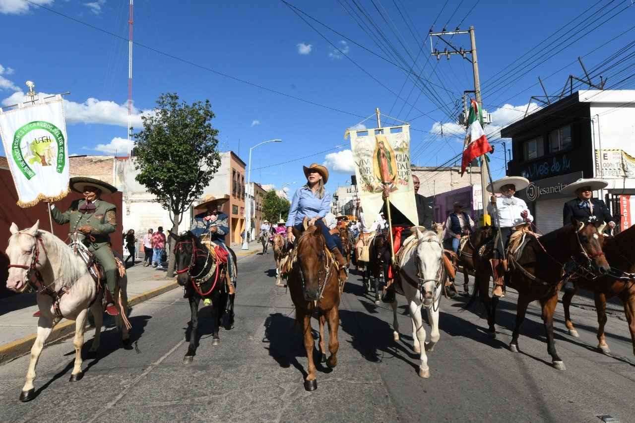 La presidenta municipal, Lorena Alfaro García participó en la Cabalgata que recorrió las principales calles de la ciudad hasta llegar a la plaza de Los Fundadores, donde se entregó a las autoridades municipales los estandartes y el fuego simbólico para su resguardo.